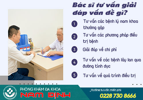 Nam giới sẽ được các bác sĩ chuyên khoa tư vấn nguyên nhân gây bệnh, giải pháp chữa bệnh, chi phí khám bệnh, những lưu ý cần nắm rõ trước và sau việc chữa bệnh ngoại khoa hoặc tư vấn về kiến thức chăm sóc sức khỏe nam giới. Để được tư vấn khám ngoại khoa, bạn phải chọn một trong hai hình thức: giải đáp trực tiếp hoặc liên hệ với bác sĩ tư vấn online.