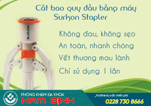 Đây được xem là bước tiến lớn của nền y học cho thủ thuật cắt bao quy đầu. Bác sĩ sử dụng máy cắt Surkon Stapler hiện đại nhằm bóc tách, loại bỏ nhanh chóng phần da bao quy đầu không cần thiết. Bệnh nhân sẽ không có cảm giác đau đớn, tại vị trí thực hiện không để lại sẹo và hầu như không gây bất kỳ biến chứng nào.