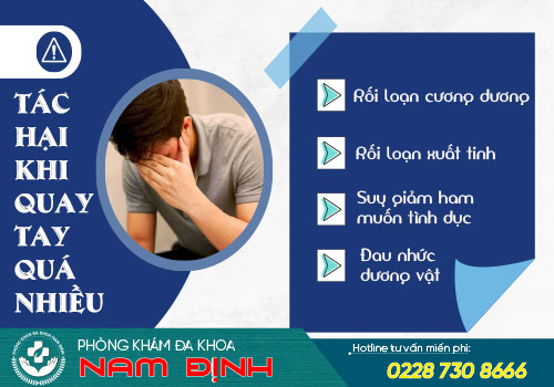 Khi quan hệ, nam giới mặc dù đang hưng phấn cao độ nhưng không thể xuất tinh hoặc xuất tinh sớm ngay khi dương vật vừa đưa vào bên trong âm đạo được vài phút (dưới 3 phút). Bên cạnh đó nam giới còn có thể gặp phải tình trạng di tinh, mộng tinh, xuất tinh ra máu, xuất tinh ngược dòng,…. Đây là những tác hại của việc quay tay với tần suất cao.