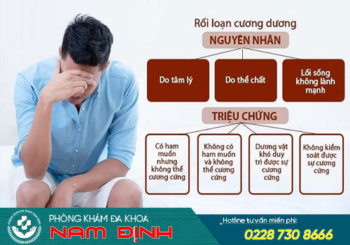 Hiện Phòng Khám Đa Khoa Nam Định – cơ sở y tế uy tín được Sở y tế cấp phép khám - hỗ trợ điều trị các bệnh lý ngoại khoa, điển hình là chứng rối loạn cương dương. Bệnh nhân được trực tiếp thăm khám, chẩn đoán và hỗ trợ điều trị từ đội ngũ y bác sĩ chuyên khoa đầu ngành, trước khi về phòng khám đã từng công tác, làm việc tại các bệnh viện lớn. Cơ sở vật chất phòng khám khang trang, đầu tư trang thiết bị hiện đại, kỹ thuật hỗ trợ điều trị tân tiến giúp đem lại hiệu quả tốt cho người bệnh.
