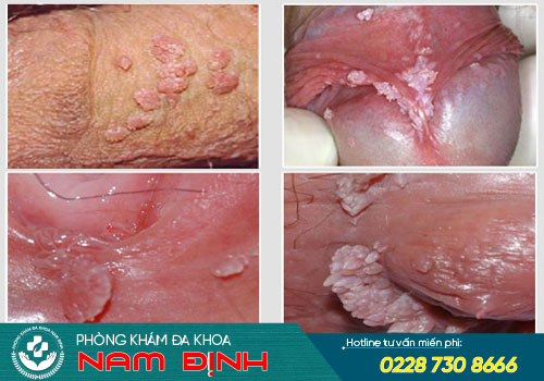 ● Bệnh sùi mào gà: Đầu tiên, nam giới thấy xung quanh khu vực “nhạy cảm” xuất hiện những mụn nhỏ, màu đỏ, mọc rải rác với kích thước 1-2mm, không ngứa, không gây đau, không chảy máu,... sau một thời gian, mụn thịt phát triển nhanh chóng lên đến vài cm, tụ lại từng đám như hoa súp lơ, mào gà,… khi sang chấn có thể dẫn tới chảy mủ ở đầu mụn kèm mùi hôi khó chịu.